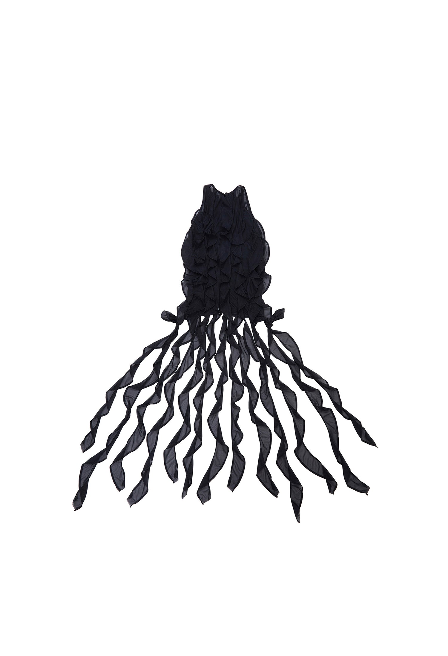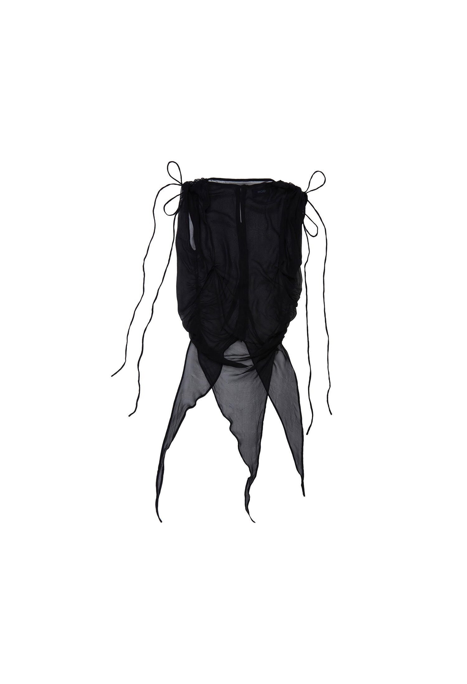 A free-hand draped top with elastics on shoulder, side torso, and self-tied ribbon on shoulder.