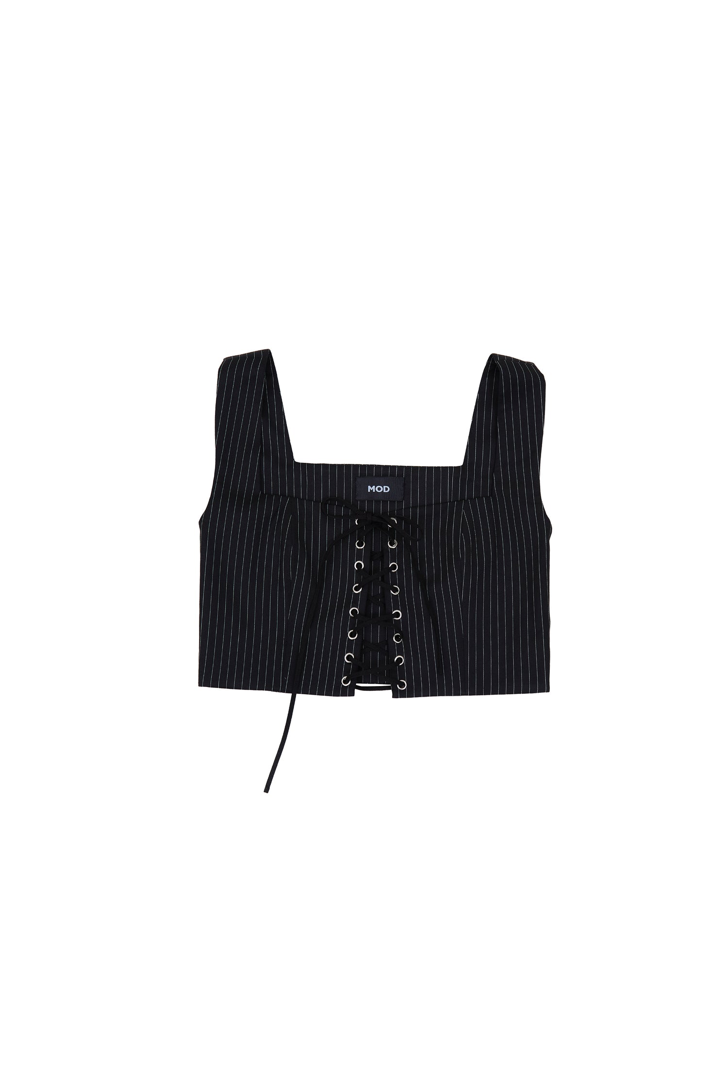 Tank vest top with eyelets, interlining, body boning, and side zipper opening.